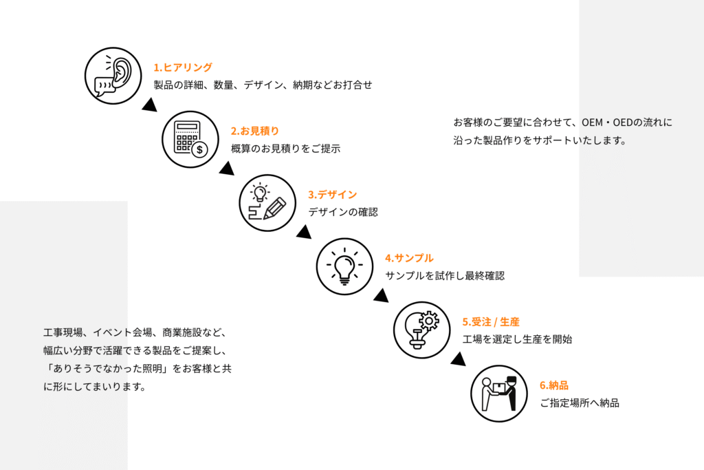 当社では、仮設照明をはじめ、各種LED照明や関連製品のOEM・ODM開発を承っております。